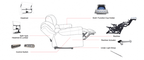 以电动款沙发为例,沙发内置913D电动铁架、电动座位驱动器、电动枕头驱动器和电动头枕铁架,并配置手控开关、AC插座和电源,以适应不同成品功能沙发的需求。