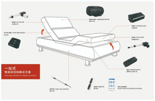 提供包括驱动器、手控器、床底自动照明、振动按摩等在内的一站式智能床解决方案,可覆盖1~5电机床控应用场景;