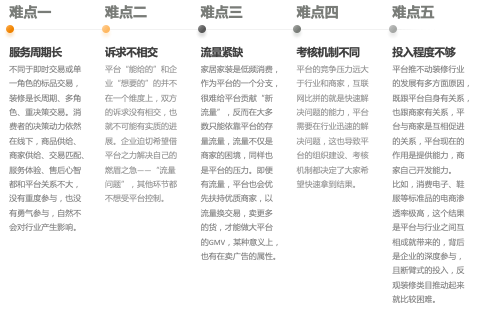 对于电商平台而言,布局家居家装有服务周期长、诉求不相交、流量紧缺、考核机制不同、投入程度不够五方面的难点,电商平台对于家居家装产业的渗透还比较有限,但长期依然值得关注。