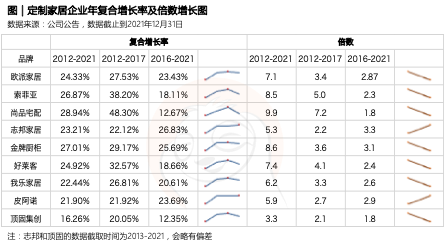 《树懒研究》认为,2012-2021这十年,9家定制企业年复合增长率的中位数在24%。以上市前和上市后两个阶段来看,2012-2017年这五年,年复合增长率的中位数是27.53%,2016-2021这五年,年复合增长率中位数是20.61%。一方面说明,上市前5年的增长情况要好于最近五年;另一方面,伴随企业体量的增大,均不同程度出现增速放缓的情况。