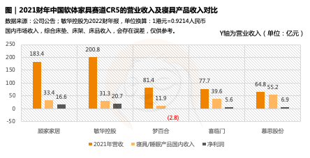 目前来看,CR 5中,慕思以55.17亿元的营收占据第一,占比达32.72%,慕思股份2019-2021年营收复合增长率达到29.54%。作为行业标杆,慕思的价值体现主要在产品创新、智能制造、文化理念、经营用户几个方面,从而形成一个完整闭环。对于未来的增长潜力,慕思将从寝具品牌,到一站式软体家居解决方案提供商。