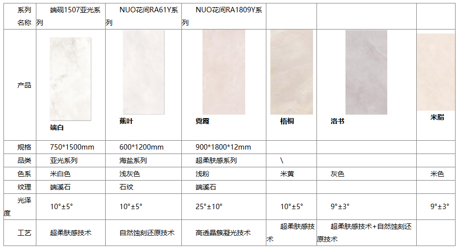 核心产品类型:主打哑光质感瓷砖,避免光污染。涵盖木纹砖、仿古砖、岩板等特色系列,色系以中性色为主。